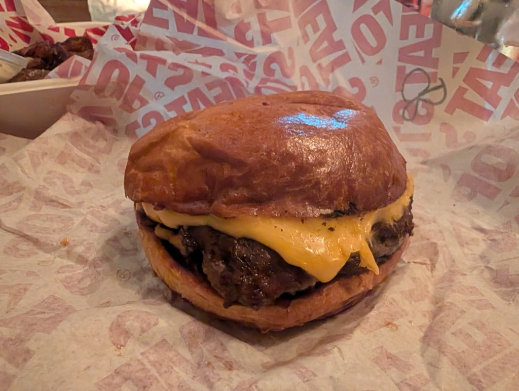 It’s a pretty burger. It arrived wrapped, which probably helped the melt on that glorious cheese. The char on the burger and the onions is in obvious evidence – Oklahoma style, for the uninitiated, involves layering a large pile of thin-sliced onions on the raw side of the patty after it hits the grill, then flipping it and charring them in. The bun is toasted, warm and soft to touch. It’s good.
