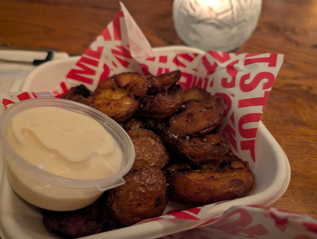 As to the side… No fries here, just these skin-on new potatoes, cut into uneven chunks. The result is a mix of crispy corners and chunky, fluffy new potato clouds, all heavily salted and served with a sauce of your choosing (at a premium of 2 quid per sauce pot). I went for a garlic aioli, which added a slick tempering of the – extremely but justifiably – heavily salted new potatoes. I normally gravitate exclusively to the crisp chunks but the fluffier, chunkier lumps were delicious too. I unexpectedly inhaled the substantial portion; can recommend.