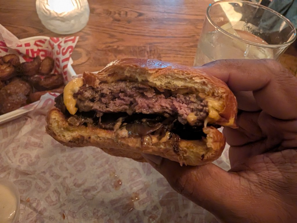 As to its limitations, it’s hard to critique this as I haven’t had a lot of Oklahoma style burgers in the past so I don’t have much of a frame of reference. From what I’ve heard, they sometimes have a bit more sweetness and crunch from the onions, and the burger does want somewhat for textural contrast. It’s very… soft. But that’s lovely in its own way; the onions cooking on the grill are meant to steam the burger and leave it tender and fresh. From a sweet/savoury contrast perspective, I don’t know if you’d pollute Oklahoma style with some burger sauce or relish, but it was *very* savoury. I love that, so happy with it as was, but thoughtful about the possibility.