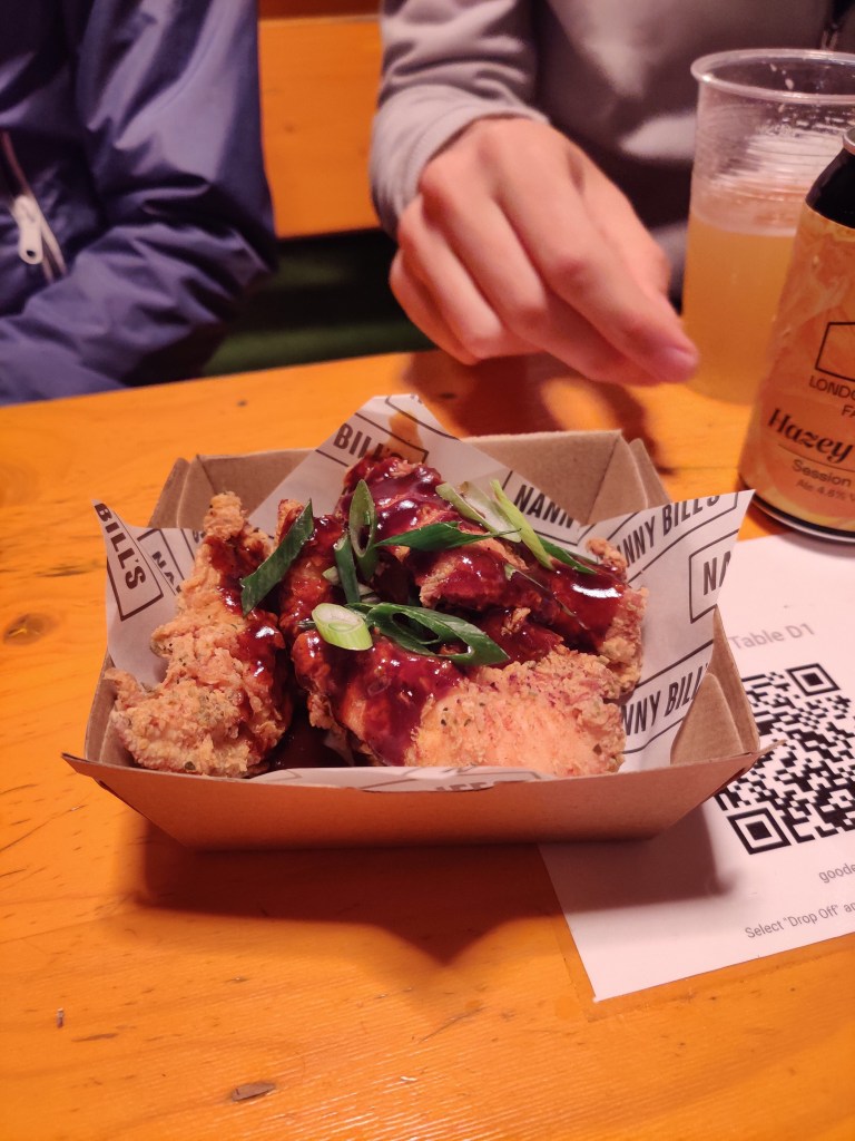 The chicken bites were reasonably seasoned, hot, juice, somewhat crisp and fresh. BUT – another £7 or so later – they were hugely erratically sized, the supplied BBQ sauce was saccharine and insipid, and – on the whole – I’d rather have had another burger.