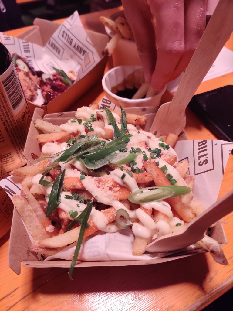 The world underestimates crinkle cut fries. Or maybe it’s just me, too used to having them slightly underdone from a McCain’s bag when I’m rushing cooking supper at home. But well done – as these are – they are beautiful, full of crisp surface area, replete with soft, hot, luscious potato. The ‘herb and bacon [and spring onion]’ build is self-assembly, provided in pots and tipped ingloriously over them, adding creamy sweetness (from the mayo), bright freshness (the spring onion) and crispy crunch (guess from where?). It’s great, though for the price – £7 ish IIRC – the portion is far too small.