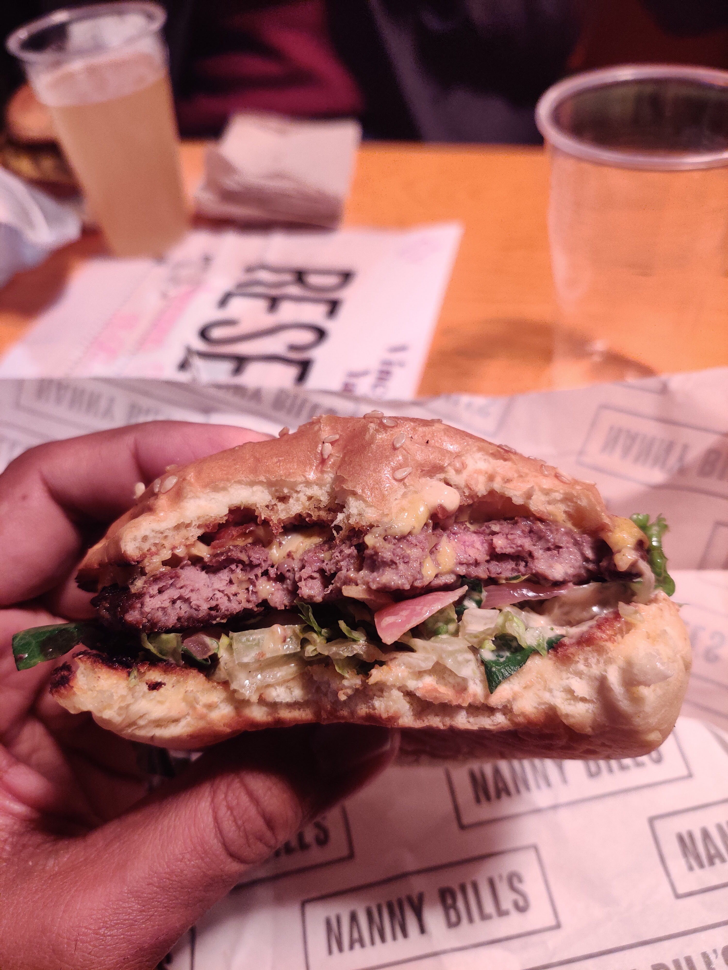 Turns out, James wasn’t seeing this through a lens of greed. This is a small burger (4oz max, at a guess), but in a delightfully soft, brilliantly yellow brioche bun. A perfectly melted American cheese is evident and dark, crisp bacon peeks around the edges. You can sense rather than see the shake shack sauce.