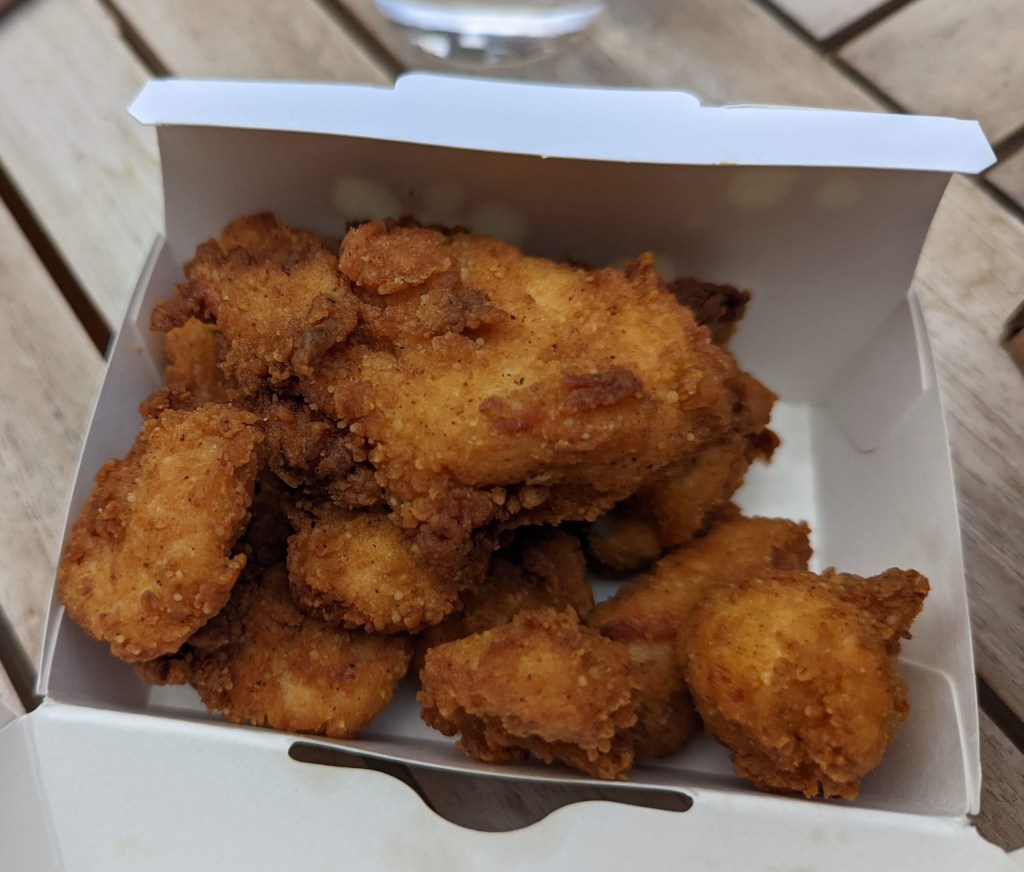 The chicken bites were reasonably seasoned, hot, juice, somewhat crisp and fresh. BUT – another £7 or so later – they were hugely erratically sized, the supplied BBQ sauce was saccharine and insipid, and – on the whole – I’d rather have had another burger.
