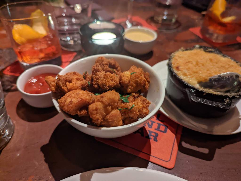 To the sides; the fries are superb, crisp exterior, fluffy interior, well seasoned but otherwise little to remark. Improved by both ketchup and the garlic aioli that came with the chicken bites. The chicken bites are a thing of legend (we ordered a second portion, despite the £8 price tag) – chunks of juicy chicken thigh, brilliantly seasoned, crisp and spicy and juicy all at once. The garlic aioli was an excellent contrast, adding a slick, garlicky sweetness with a dunk. The mac & cheese was mac & cheese-like, credible and competent but about as exciting as it always is – which – to me – is limited.