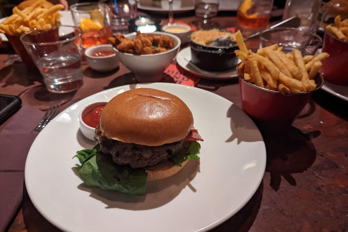 (Apologies for the lighting, it’s a stylish, dimly lit venue). It’s not easy to see, but there’s a brilliant melt on the cheese, a strong char on the burger, the bun is soft, the bacon in clear evidence. Lots good so far.