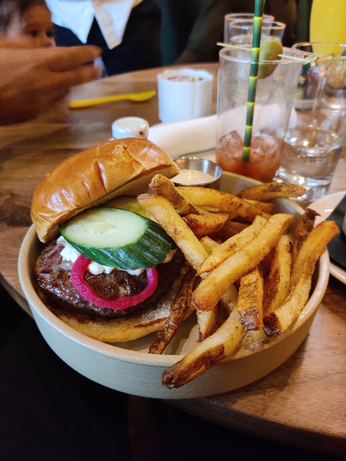 I had the Seven Seeds Burger – Angus beef, goat cheese, shaved cucumber, pickled red onion, toum.