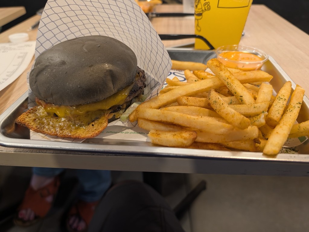 It looks alright, you know. The charcoal bun is a mystery to me but it looks both soft and well made. The cheese crisp from where the overmelt has fried up on the griddle looks extremely inviting. The melt elsewhere is good. The fries look golden brown and creatively seasoned. There’s a tub of something that looks like firecracker sauce on the side. The bottomless soft drink is my trademark mixture of orange juice (well, Minute Maid) and lemonade (well, Sprite). There’s even a side of chicken nuggets that my eyes made me order.