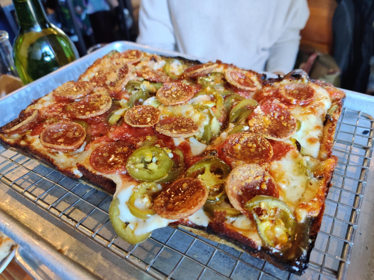It’s utterly glorious. The skirt is crisp without being burnt, bubbled and crispy with oil or butter. The pepperoni is delightfully crunchy, and the generous helping of both pepperoni and jalapeños leaves you searching for the browned, stretchy, generously spread cheese beneath.