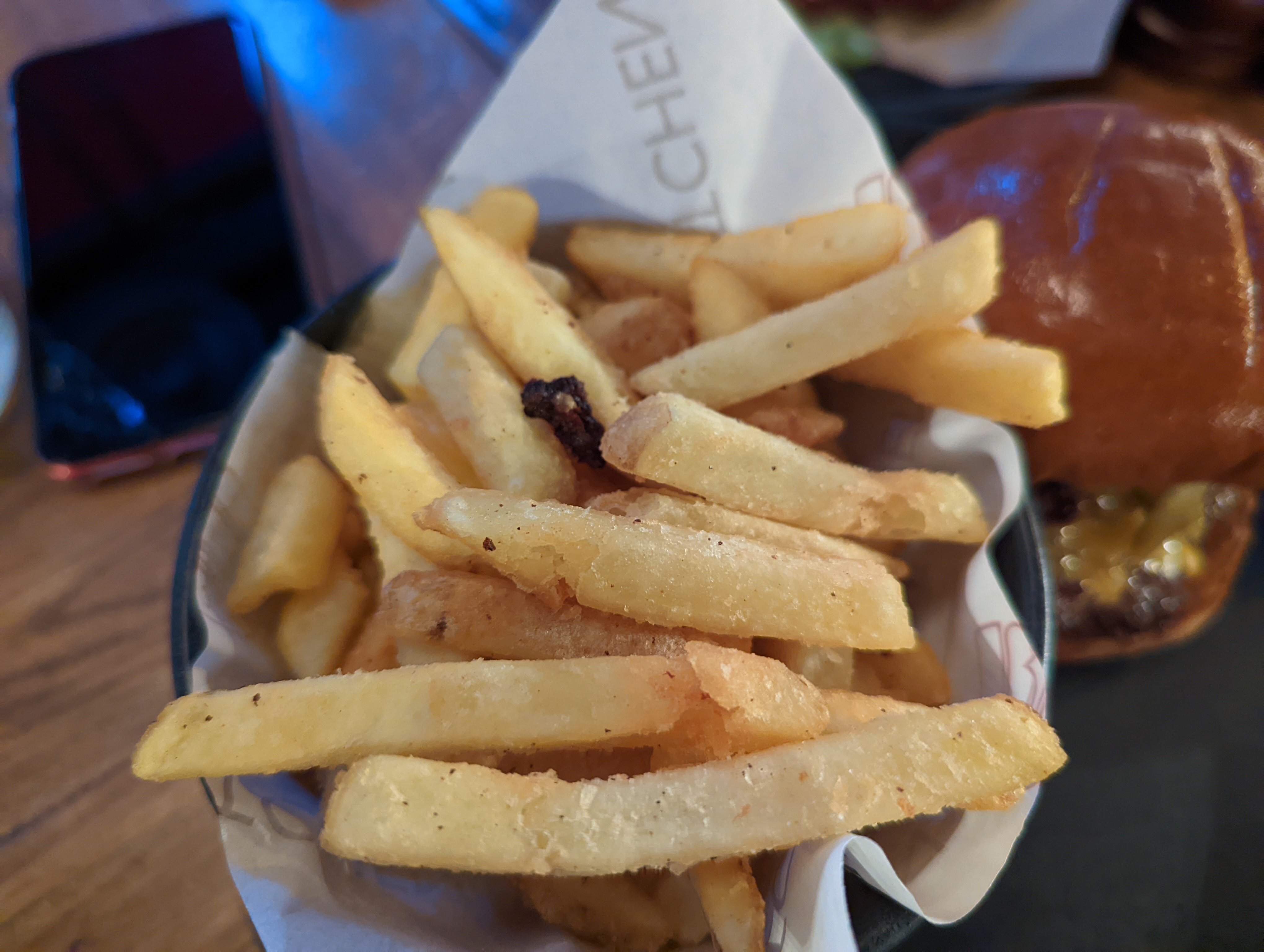 The fries are topped with salt and something that looks like pepper but brings no noticeable flavour. They are perfectly crisp and well seasoned and perfect for dunking in mayo and ketchup. Whilst the core fries are – I suspect – frozen from a wholesaler – there’s little to complain about.