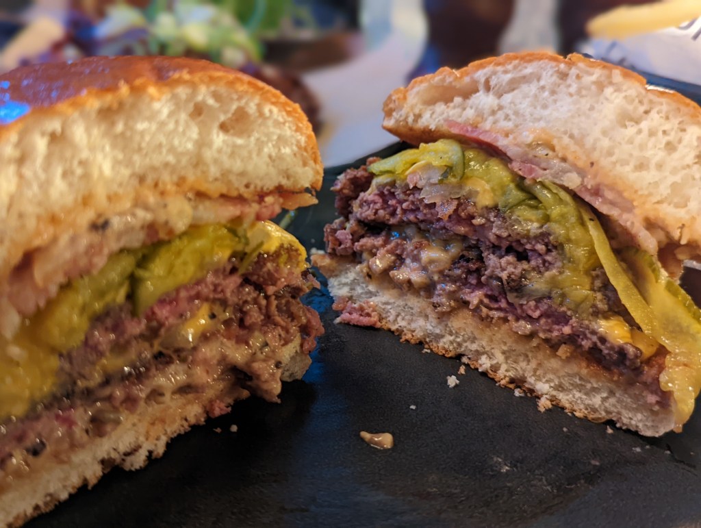 The patties are well formed and the stack is well made, for all that the greed of the third burger meant the bun really didn’t hold up to it and the surplus of sauce and cheese made this unhandleable – this is a burger that had to be eaten with cutlery. The char of the smash is very evident and adds a nice aroma to the burger. I’m excited.